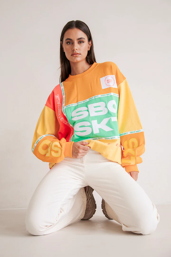 The uni-sex Hidden Valley Sweater is made from a natural terry back cotton sweater fabric in orange, yellow, green and red hues. It is an oversized vintage style featuring a crew neck, ribbed trims on neckline, hem and sleeve cuffs, extra long full length sleeves with embroidery, patch and tape detailing throughout. Style your sweater with denim or pair with bike shorts! Designed exclusively by Sabo.